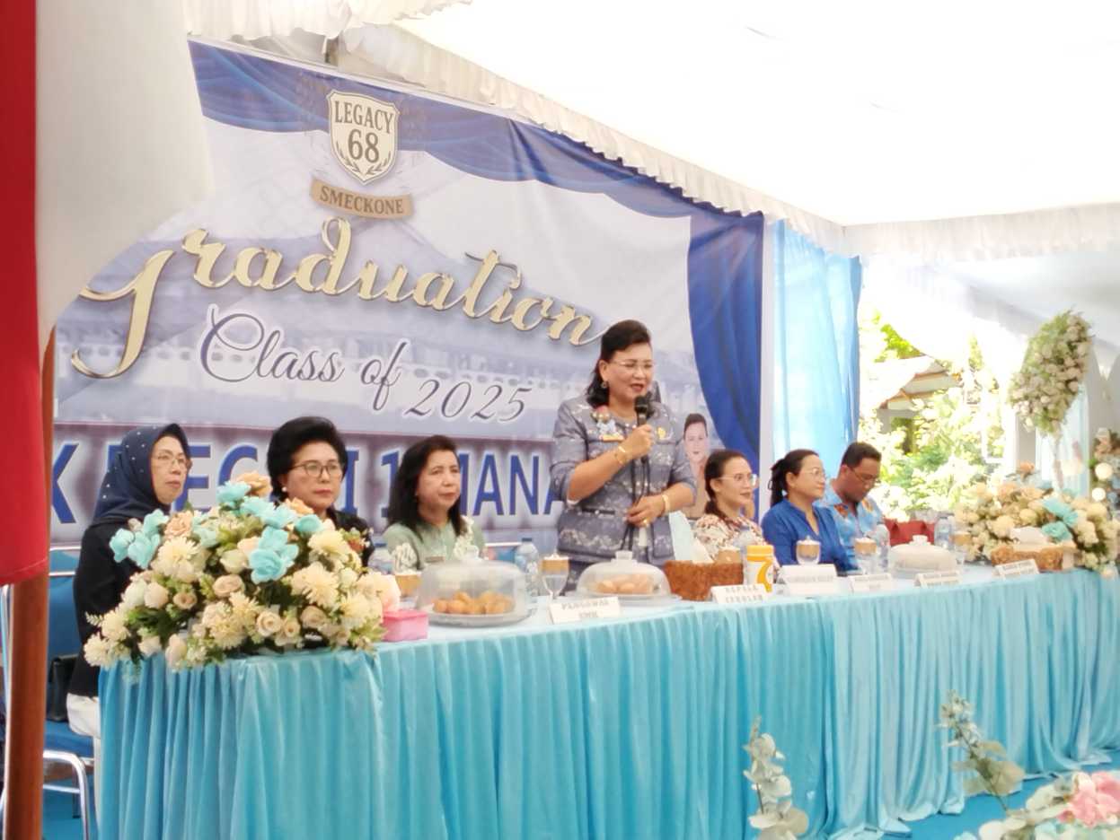 Kepala Sekolah SMK Negeri 1 Manado, Telly Olivia A. Ticoalu, S.Pd., M.Si., tampil memukau dalam sambutannya yang sarat makna. Ia mengingatkan para lulusan agar senantiasa menjaga nama baik almamater, menunjukkan karakter unggul, dan menjadi pribadi yang santun serta tangguh dalam menghadapi tantangan hidup. “Orang hebat bukan hanya cerdas, tapi juga berkarakter. Jadilah kebanggaan keluarga dan masyarakat,” tegasnya.