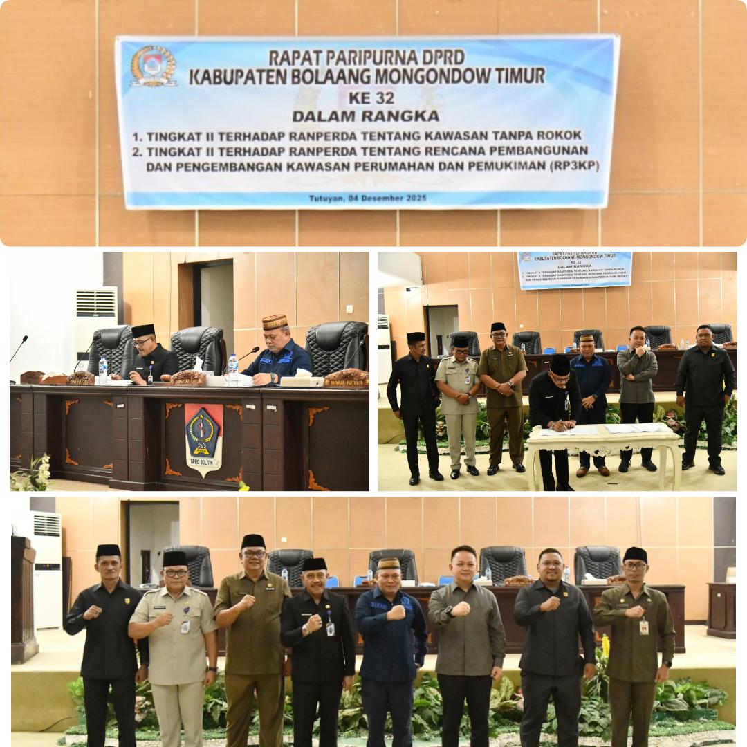 BOLTIM, NyiurNews.com — Pemerintah Kabupaten Bolaang Mongondow Timur (Boltim) menegaskan komitmen peningkatan kualitas layanan publik melalui penetapan dua regulasi strategis: Perda tentang Kawasan Tanpa Rokok (KTR) dan Perda tentang Rencana Pembangunan dan Pengembangan Perumahan dan Kawasan Permukiman (RP3KP). Penegasan ini mengemuka dalam Rapat Paripurna DPRD Boltim yang digelar di Ruang Paripurna, Kamis (4/12/2025), dan dihadiri Sekretaris Daerah M. Iksan Pangalima mewakili Bupati Boltim, Oskar Manoppo.