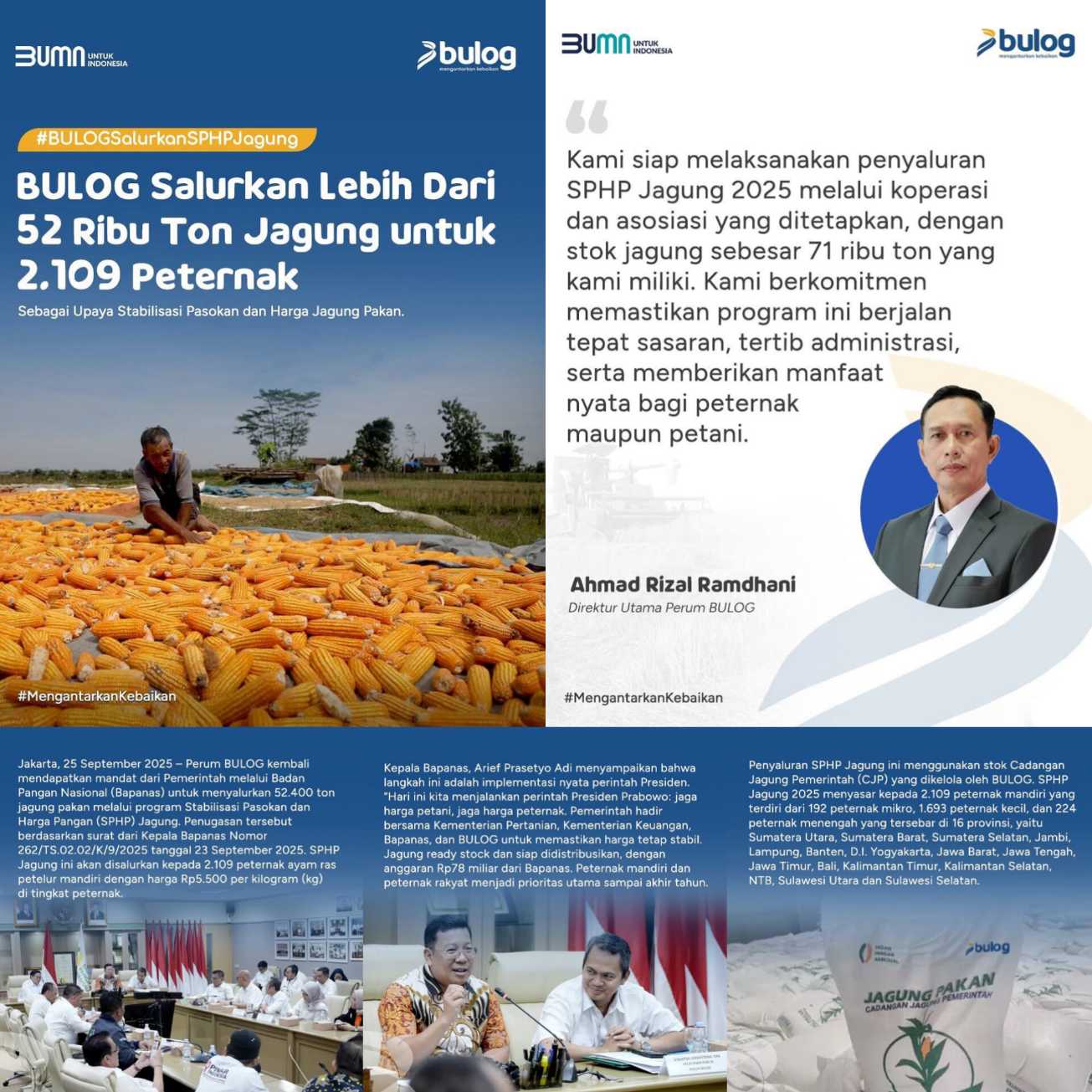 Langkah nyata BULOG ini sejalan dengan arahan Presiden RI untuk menjaga keseimbangan harga petani dan melindungi peternak. Penyaluran dilakukan menggunakan stok Cadangan Jagung Pemerintah (CJP) yang dikelola BULOG, dengan sasaran peternak mikro, kecil, hingga menengah. Dengan stok yang memadai serta distribusi yang tertib dan tepat sasaran, BULOG menegaskan komitmennya menghadirkan manfaat nyata bagi peternak, petani, dan konsumen di seluruh Indonesia.