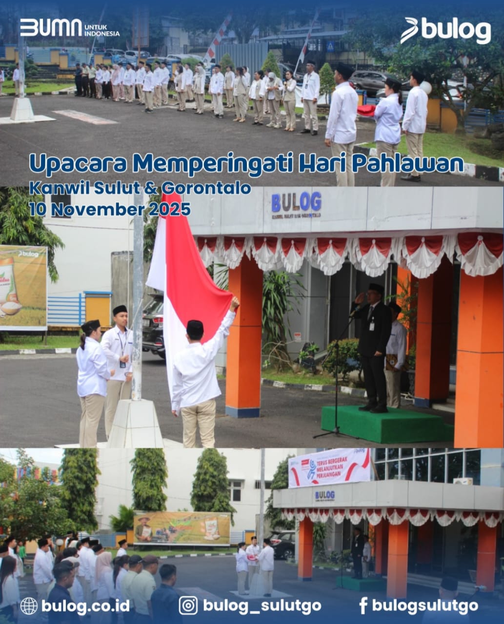 Dalam upacara penuh khidmat, Pimpinan Wilayah Bulog SulutGo, Ermin Tora, mengajak jajarannya meneladani semangat para pahlawan melalui kerja nyata dan pengabdian untuk ketahanan pangan negeri.