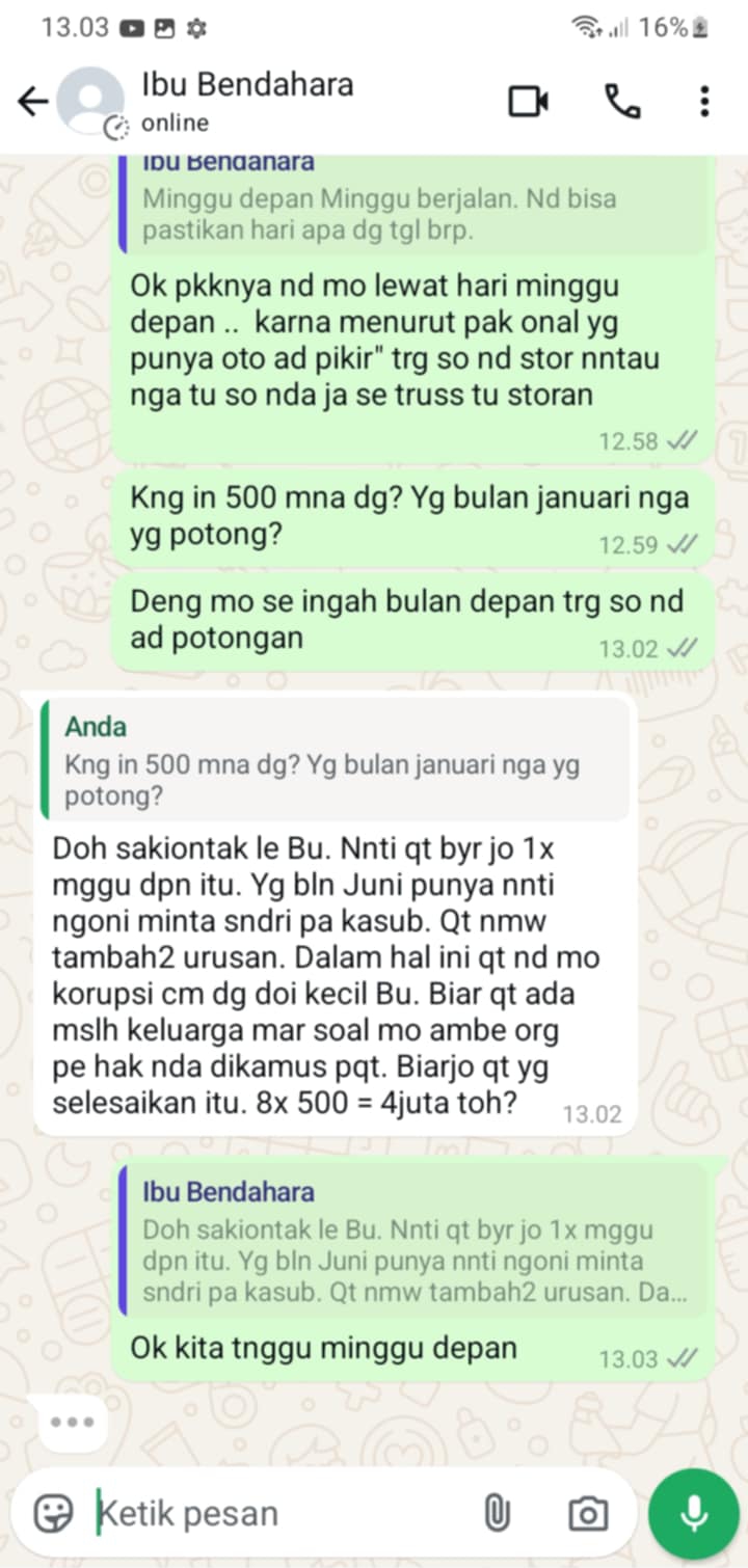 Saat dikonfirmasi melalui WhatsApp, oknum GP justru berkelit. “Nanti kita bayar jo minggu depan… yang bulan Juni punya, minta sendiri pa kasub,” demikian kutipan pesannya. Sebuah pernyataan yang tidak hanya menunjukkan sikap lepas tangan, tetapi juga membuktikan dugaan permainan kotor dalam pengelolaan keuangan Kecamatan Tikala. Jika ini bukan korupsi, lalu apa namanya?