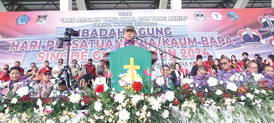 Gubernur Provinsi Sulawesi Utara, Prof DR (HC) Olly Dondokambey hadir dalam Ibadah Agung Hari Persatuan Pria Kaum Bapa (Hapsa PKB) GMIM tahun 2024 yang digelar di Stadion Maesa Tondano, Kabupaten Minahasa, Jumat (7/6/2024).