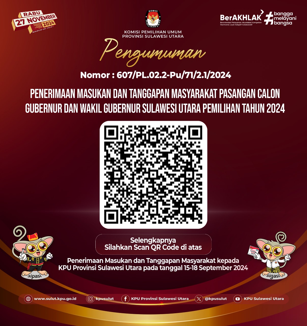 Surat pengumuman KPU Sulut yang diterbitkan pada tanggal 15 September 2024 tentang penerimaan masukan dan tanggapan masyarakat terhadap pasangan calon Gubernur dan Wakil Gubernur Pilkada Tahun 2024 di Sulawesi Utara dapat diakses melalui tautan resmi KPU Sulut.