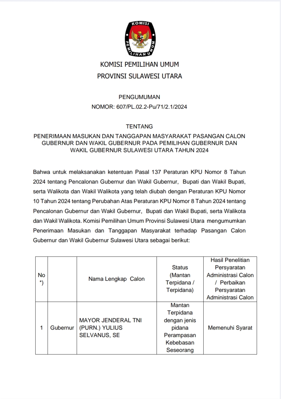 Dengan pengumuman penerimaan tanggapan dan masukan masyarakat, KPU telah melaksanakan ketentuan peraturan terkait pencalonan Gubernur dan Wakil Gubernur berdasarkan Peraturan KPU Nomor 8 dan 10 Tahun 2024.