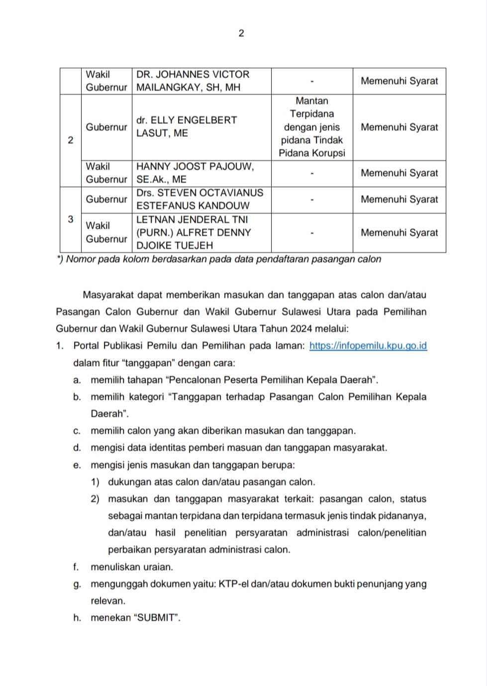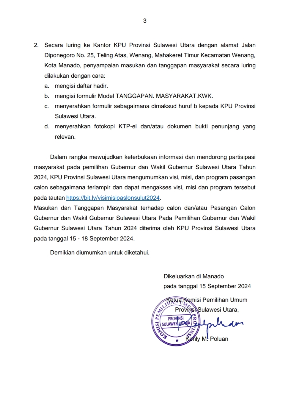 Alternatifnya, masyarakat juga dapat memberikan tanggapan secara langsung ke Kantor KPU Provinsi Sulawesi Utara dengan mengisi formulir dan menyertakan dokumen relevan.