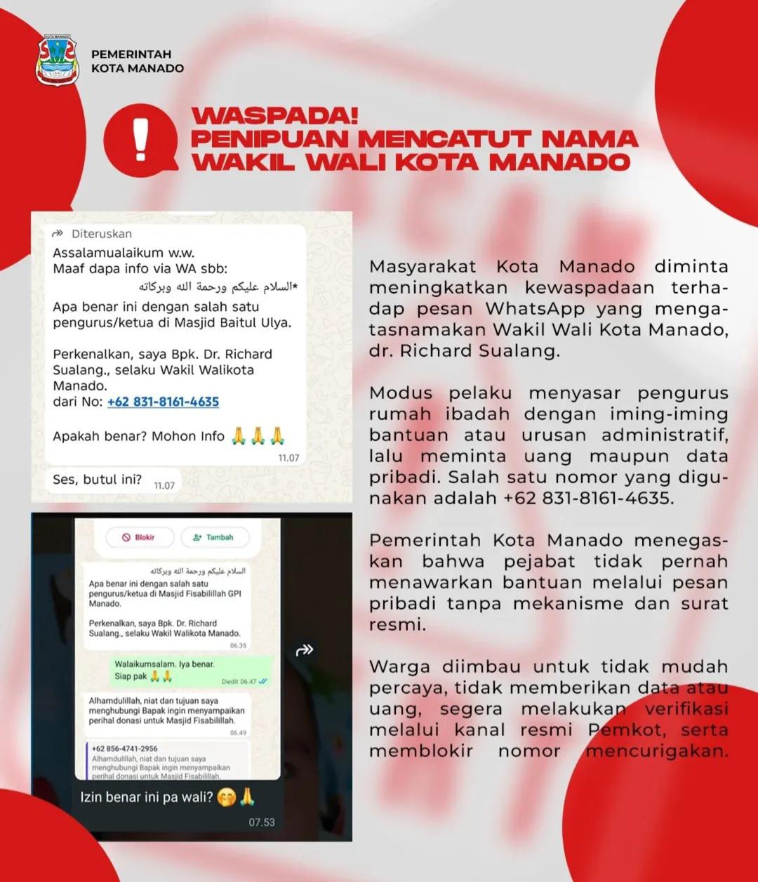 MANADO, NyiurNews.com – Masyarakat Kota Manado diminta meningkatkan kewaspadaan terhadap pesan WhatsApp yang mengatasnamakan Wakil Wali Kota Manado, dr. Richard Sualang. Modus pelaku menyasar pengurus rumah ibadah dengan dalih menawarkan bantuan atau mengurus administrasi tertentu, lalu berujung pada permintaan uang maupun data pribadi. Salah satu nomor yang digunakan dalam aksi tersebut yakni +62 831-8161-4635. Pemerintah Kota Manado menegaskan, pejabat pemerintah tidak pernah menawarkan bantuan melalui pesan pribadi tanpa mekanisme yang sah dan surat resmi. Warga diimbau untuk tidak mudah percaya terhadap nomor tak dikenal, tidak memberikan data maupun uang, serta melakukan verifikasi melalui kanal resmi Pemkot sebelum mengambil langkah lanjutan.