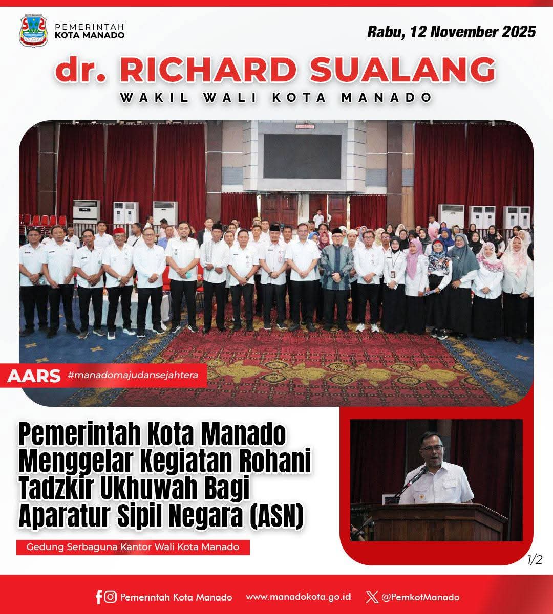 MANADO, NyiurNews.Com = Dalam denyut aktivitas birokrasi yang tak pernah padam, Pemerintah Kota Manado menghadirkan jeda yang penuh makna—Tadzkir Ukhuwah bagi para Aparatur Sipil Negara, Rabu (12/11/2025). Bukan sekadar seremoni rohani, kegiatan bertema “Meningkatkan Produktivitas Kerja dengan Taqwa” ini menjadi ruang refleksi bagi setiap ASN untuk menakar kembali arah pengabdian mereka. Di podium yang sederhana namun sarat makna, Wakil Wali Kota Manado, dr. Richard Sualang, menegaskan bahwa ketulusan dan iman adalah bahan bakar sejati yang menggerakkan semangat pelayanan. “Jadikan nilai takwa sebagai modal utama dalam bekerja dan melayani masyarakat,” ujarnya dengan suara yang mengalun mantap—menyentuh ruang batin hadirin yang larut dalam suasana hikmat.