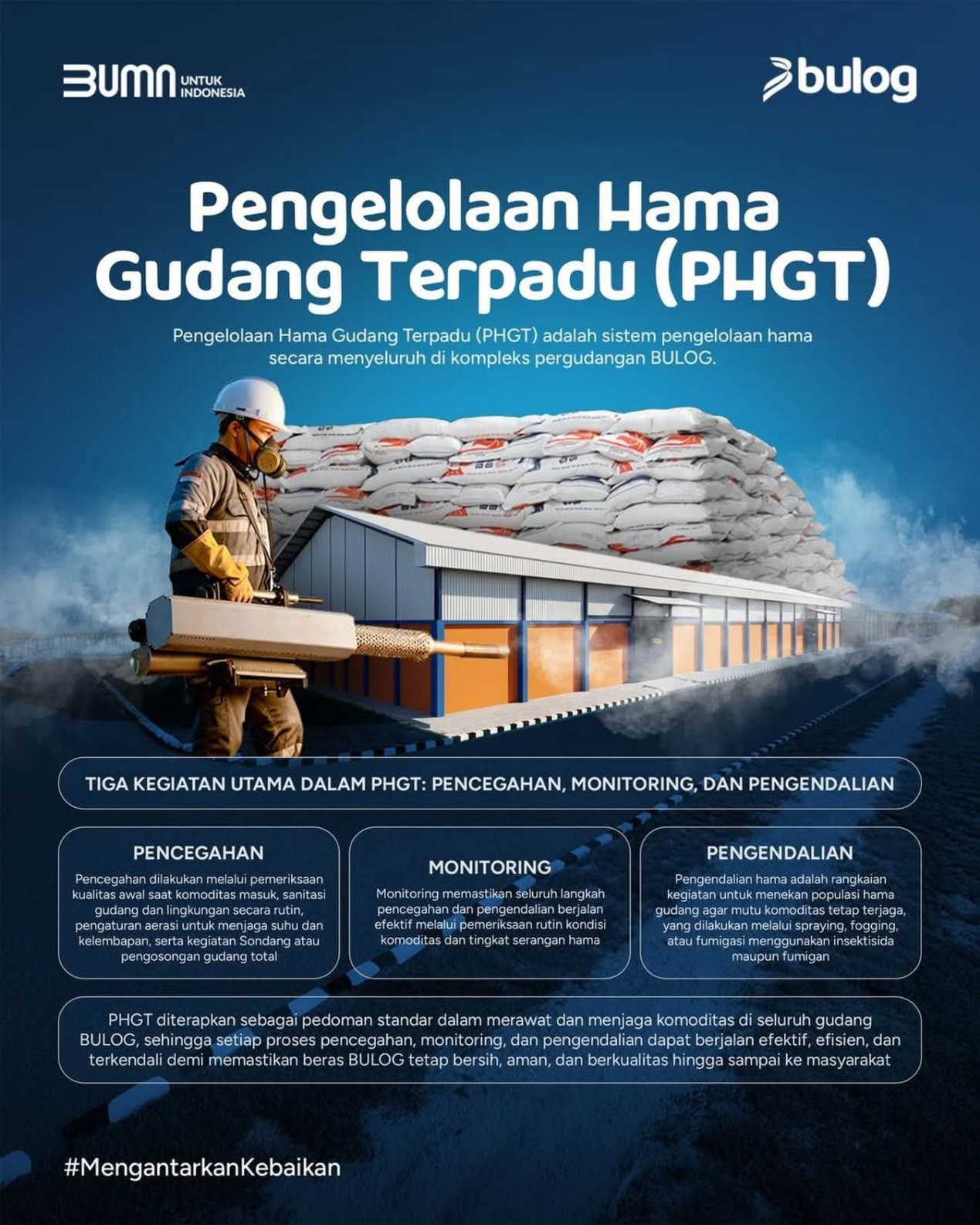 Pimpinan Wilayah Bulog SulutGo, Ermin Tora, menegaskan bahwa penerapan PHGT bukan sekadar rutinitas operasional, tetapi wujud tanggung jawab lembaga dalam menjaga kepercayaan publik. “Kami memastikan seluruh stok terlindungi melalui standar yang terukur. PHGT memperkuat kesiapan kami melayani masyarakat dengan kualitas yang tidak hanya stabil, tetapi dapat dipertanggungjawabkan,” ujarnya. Di bawah koordinasinya, Bulog SulutGo terus menampilkan kinerja positif sebagai garda terdepan penyedia pangan berkualitas di kawasan timur Indonesia.