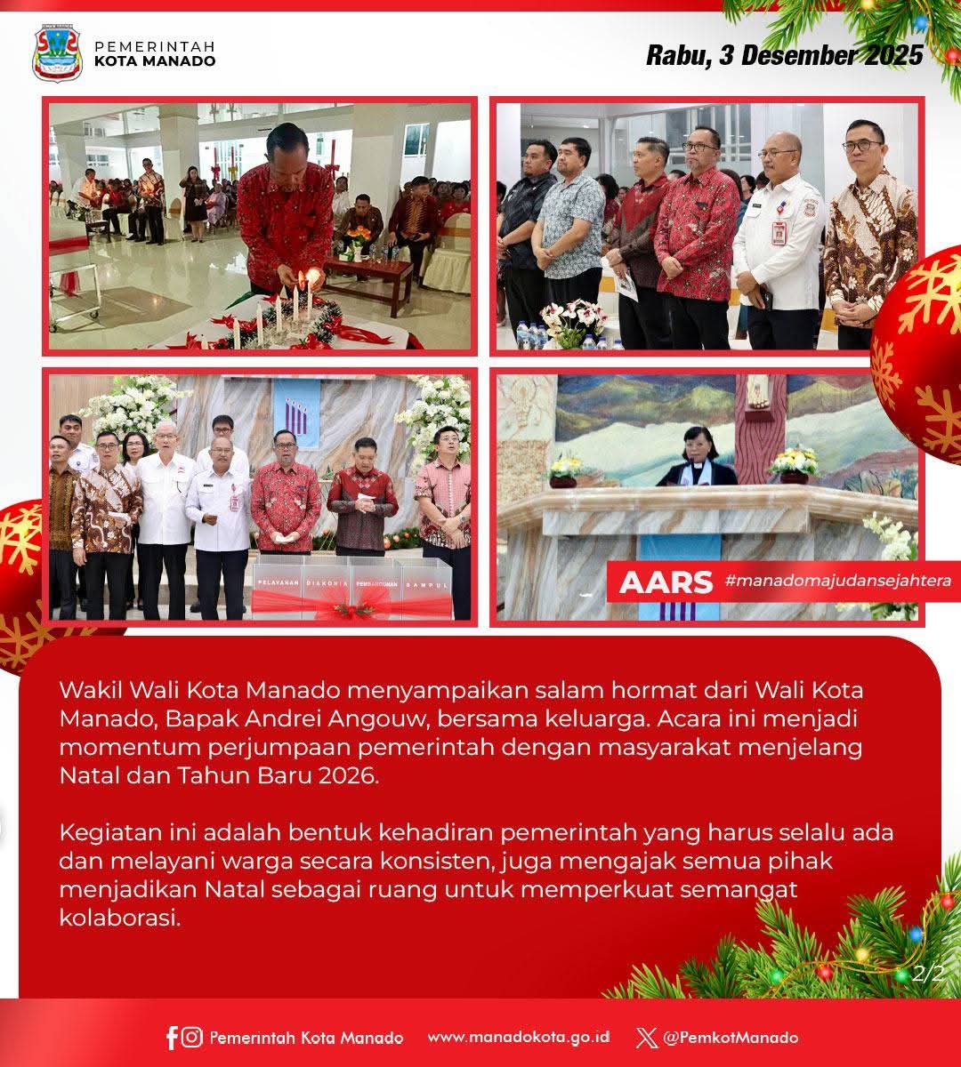 MANADO, NyiurNews.com – Pemerintah Kota Manado kembali menggelar Safari Natal 2025 sebagai ruang perjumpaan dengan masyarakat jelang pergantian tahun. Dalam ibadah yang berlangsung di GMIM Kalvari Parigi Tujuh, Kecamatan Singkil, Rabu (3/12/2025), Wakil Wali Kota Manado, dr. Richard Sualang, hadir mewakili Wali Kota Andrei Angouw untuk menyampaikan salam hormat kepada jemaat. Richard menegaskan bahwa kegiatan ini merupakan bentuk kehadiran pemerintah yang tidak hanya seremonial, tetapi upaya menjaga kedekatan serta memastikan pelayanan tetap berjalan bagi seluruh warga kota.