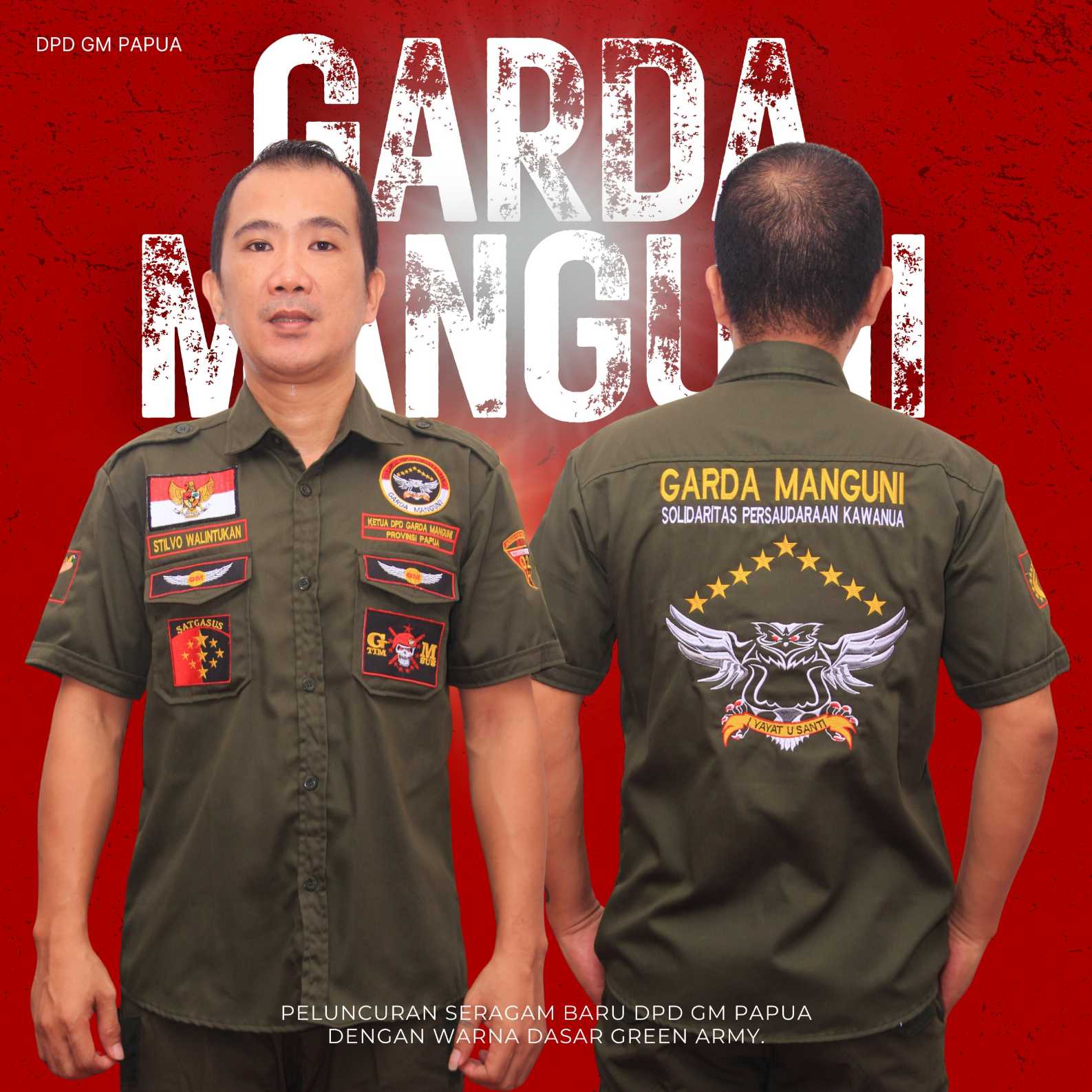 Stilvo Walintukan, Ketua DPD GM Papua, tampil memperkenalkan seragam baru green army sebagai simbol perubahan dan solidaritas organisasi. [ Kolase : Humas Infokom DPD GM Papua ]